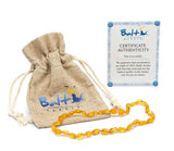 A certificate of authenticity and a jute bag comes with all of our necklaces. Therefore, you can rest assured that you are buying a real amber necklace and that your child will reap its benefits.