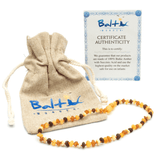 While Baltic Amber itself is non-toxic, parents should ensure that their child does not bite or chew on the amber beads to prevent a choking incident from occurring. Also, while the child should wear the necklace as often as possible to receive its full benefits, they should not wear it while sleeping to prevent strangulation.